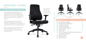 With multiple adjustability points, including back and seat height, back and seat tilt and arm adjustability, the Madison mid back chair is designed for you to receive maximum ergonomic support.